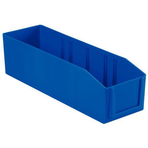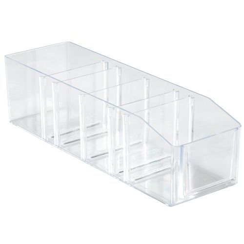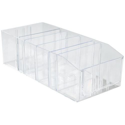 Cajón organizador robusto y compartimentable, ideal para el almacenamiento en estanterías o armarios. Abertura en la parte delantera para una visualización mejor del contenido. Paredes y fondos lisos. Buena resistencia a los ácidos.