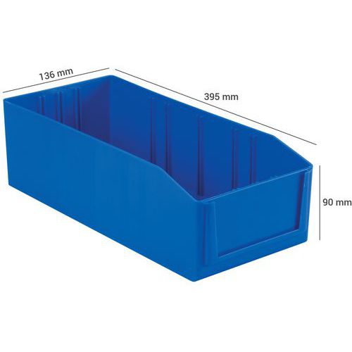Cajón organizador robusto y compartimentable, ideal para el almacenamiento en estanterías o armarios. Abertura en la parte delantera para una visualización mejor del contenido. Paredes y fondos lisos. Buena resistencia a los ácidos.