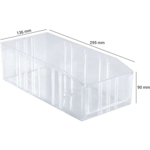 Cajón organizador robusto y compartimentable, ideal para el almacenamiento en estanterías o armarios. Abertura en la parte delantera para una visualización mejor del contenido. Paredes y fondos lisos. Buena resistencia a los ácidos.