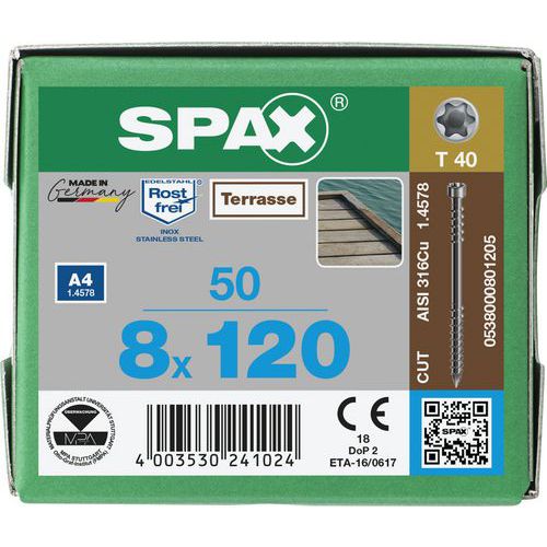 | Nombre del producto | Caja de 50 tornillos para tarima con cabeza cilíndrica TX Ø 8 mm, Material: Acero, Roscas Ø: 8 mm |