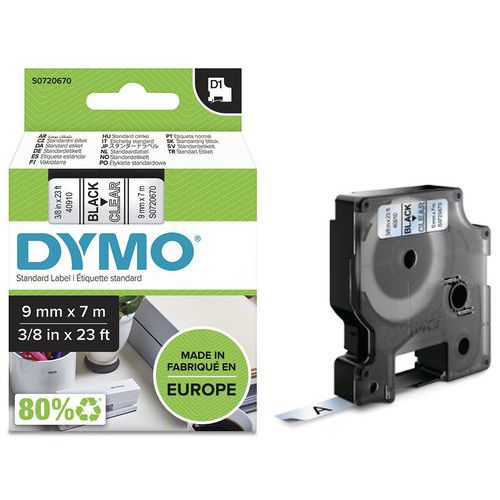 Caja de cinta D1 de 9 mm de ancho, Fondo color: Transparente, Tipo: S0720670, Cinta longitud: 7 m Caja de cinta D1 de 9 mm de ancho, Fondo color: Transparente, Tipo: S0720670, Cinta longitud: 7 m