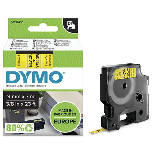 Caja de cinta D1 de 9 mm de ancho, Fondo color: Amarillo, Tipo: S0720730, Cinta longitud: 7 m Caja de cinta D1 de 9 mm de ancho, Fondo color: Amarillo, Tipo: S0720730, Cinta longitud: 7 m