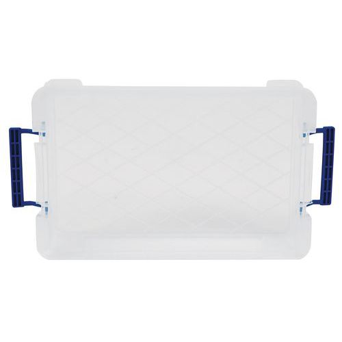Caja de almacenaje y tapa – 5,5 y 51 L – Manutan Expert Práctica caja de almacenaje que permite una visualización inmediata del contenido. Gran comodidad gracias a las asas. Garantía al cliente : 10 años Carga máx. (kg) : 120