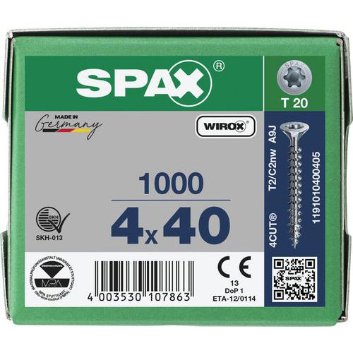 | Nombre del producto | Caja de tornillos universales de cabeza avellanada T-Star Plus TX Ø, Material: Acero, Roscas Ø: 4 mm |
