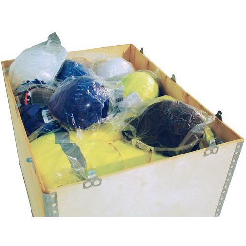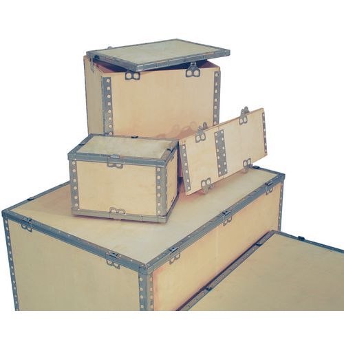 Caja de transporte para exportación de contrachapado con protección de ángulo de acero galvanizado. Resistencia excelente a las agresiones de origen mecánico y climático. Montaje, desmontaje y plegado fáciles con la ayuda de un simple destornillador. Caja precintable y personalizable mediante marcado y etiquetado. Espesor del contrachapado de la caja: 5,5 mm.