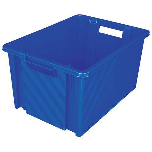Caja encajable equipada con asas abiertas que facilitan la manipulación.