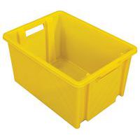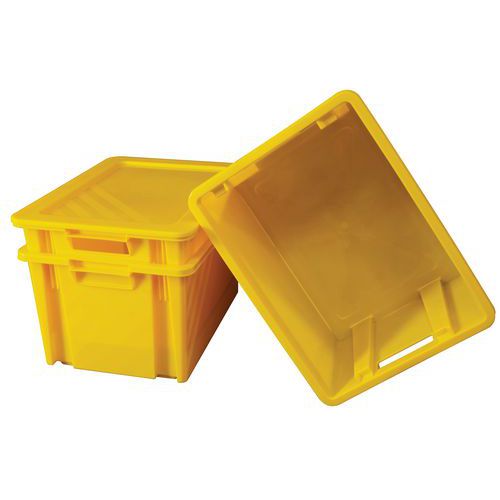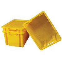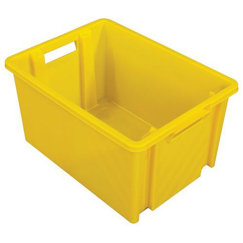 Caja encajable equipada con asas abiertas que facilitan la manipulación.