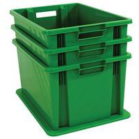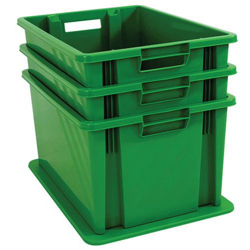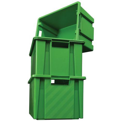 Caja encajable equipada con asas abiertas que facilitan la manipulación.