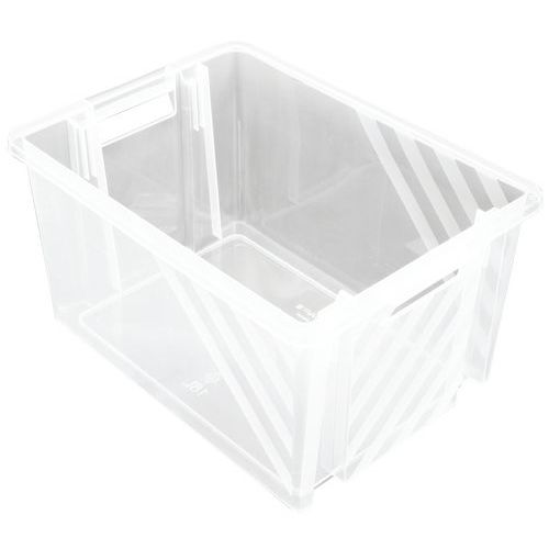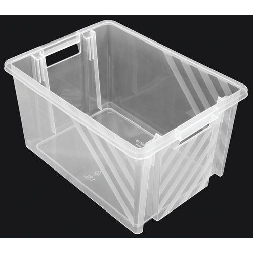 Caja encajable equipada con asas abiertas que facilitan la manipulación.