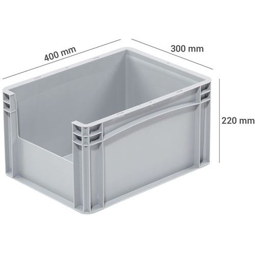 | Nombre del producto | Caja norma Europa con abertura frontal, Capacidad: 21 L, Apilable: sí, Altura total: 220 mm |