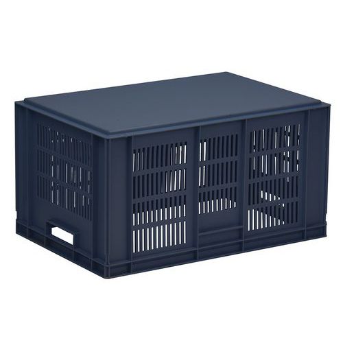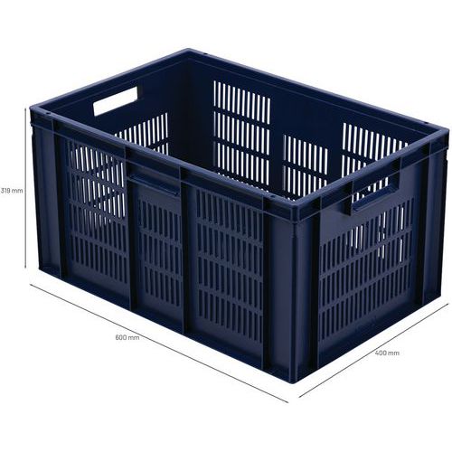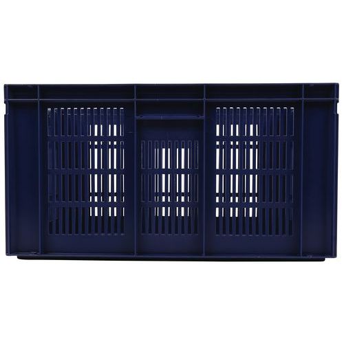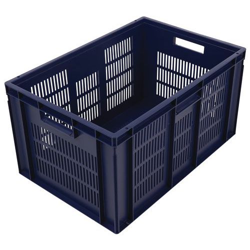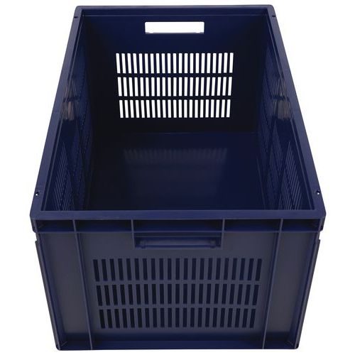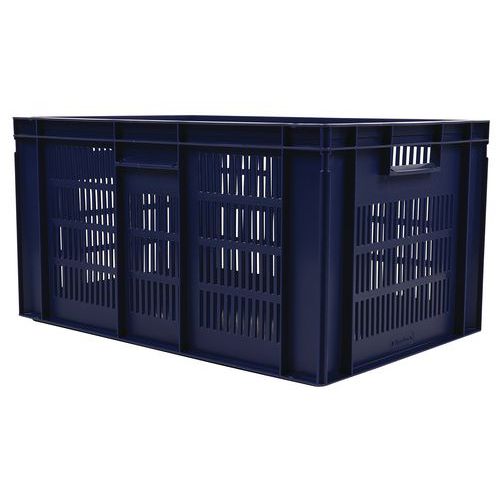 Caja azul conforme a la norma Europa muy estable al apilarla. Diseño que garantiza la máxima ventilación mediante unas paredes caladas. Manipulación sencilla gracias a sus dos asas abiertas de gran tamaño. Resistente a aceites, grasas y a numerosos productos químicos.