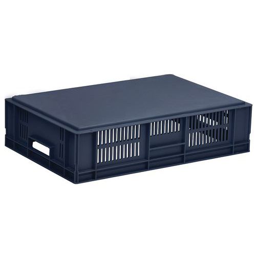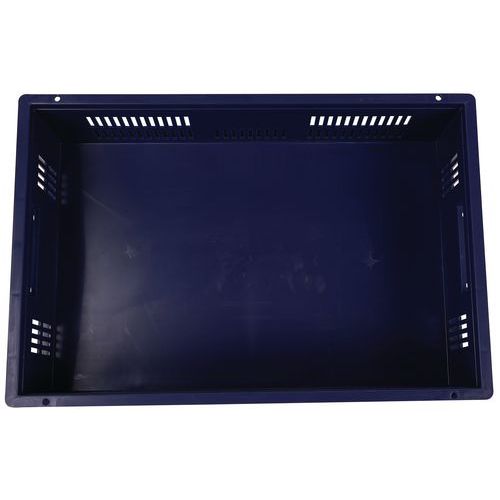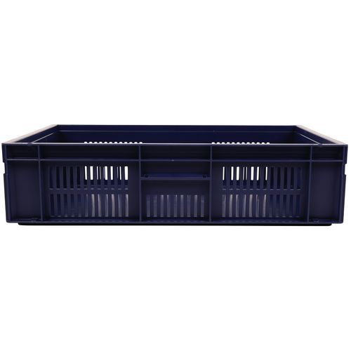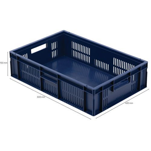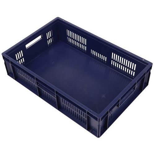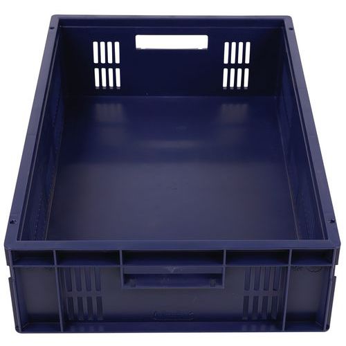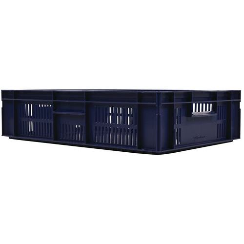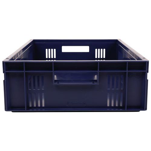 Caja azul conforme a la norma Europa muy estable al apilarla. Diseño que garantiza la máxima ventilación mediante unas paredes caladas. Manipulación sencilla gracias a sus dos asas abiertas de gran tamaño. Resistente a aceites, grasas y a numerosos productos químicos.