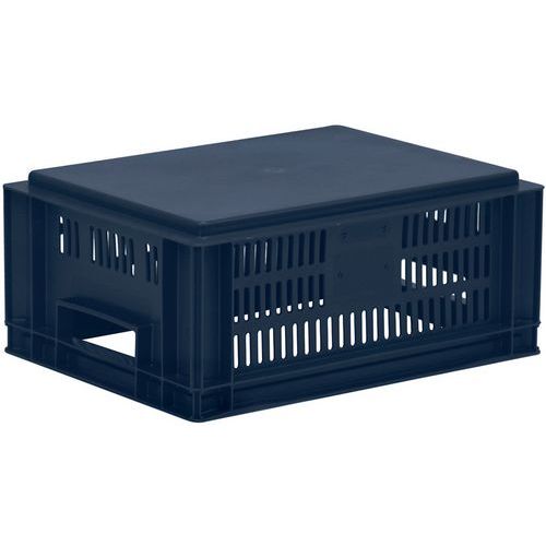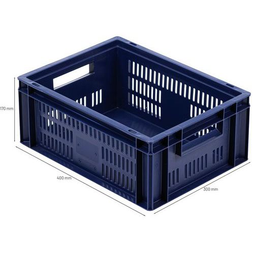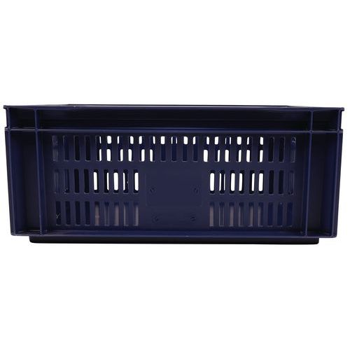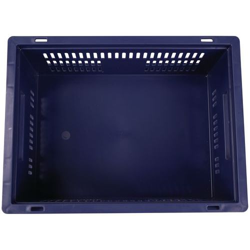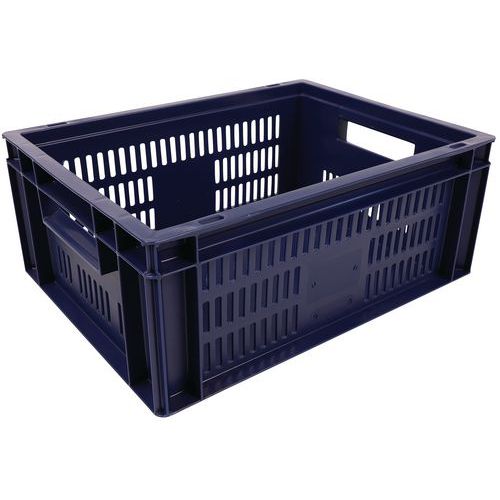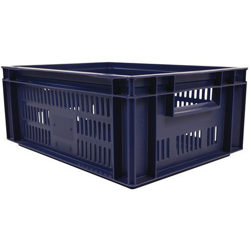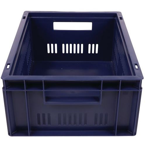Caja azul conforme a la norma Europa muy estable al apilarla. Diseño que garantiza la máxima ventilación mediante unas paredes caladas. Manipulación sencilla gracias a sus dos asas abiertas de gran tamaño. Resistente a aceites, grasas y a numerosos productos químicos.