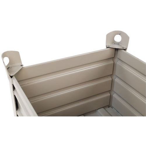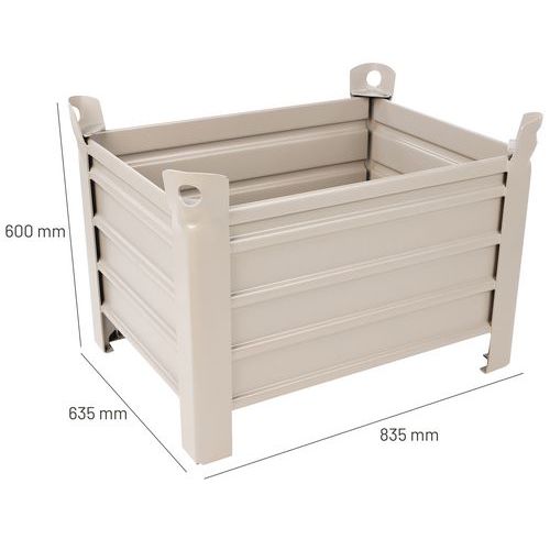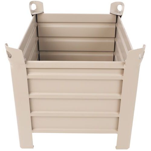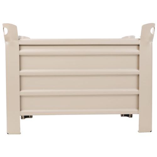 Ultrarresistente de chapa de acero con nervaduras. Caja-palé con paredes macizas. Ahorro de espacio, con capacidad de apilado de 5 cajas-palé. Gran estabilidad en el apilado con perfiles de ángulo montantes. Adecuado para las industrias mecánicas, de automoción, de fundición o de recogida de residuos.