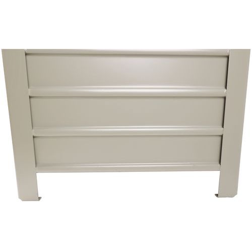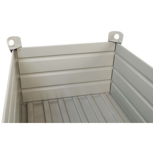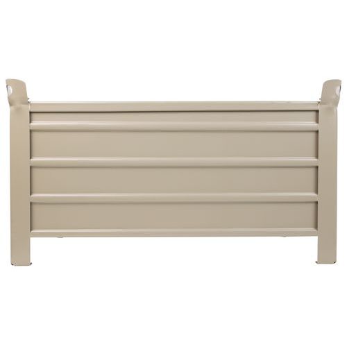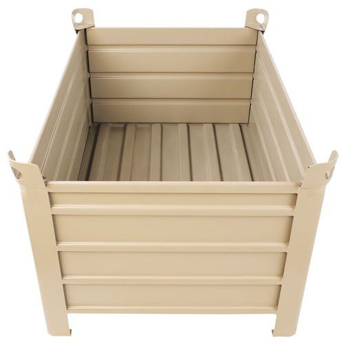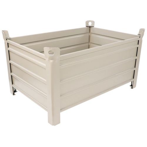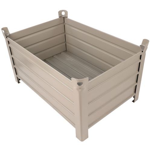 Ultrarresistente de chapa de acero con nervaduras. Caja-palé con paredes macizas. Ahorro de espacio, con capacidad de apilado de 5 cajas-palé. Gran estabilidad en el apilado con perfiles de ángulo montantes. Adecuado para las industrias mecánicas, de automoción, de fundición o de recogida de residuos.