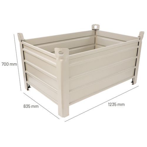 Ultrarresistente de chapa de acero con nervaduras. Caja-palé con paredes macizas. Ahorro de espacio, con capacidad de apilado de 5 cajas-palé. Gran estabilidad en el apilado con perfiles de ángulo montantes. Adecuado para las industrias mecánicas, de automoción, de fundición o de recogida de residuos.