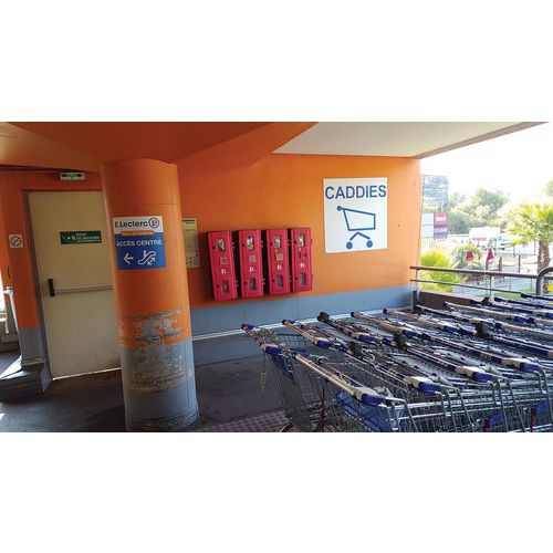 Caja para extintor de 9 a 12 kg. Puede utilizarse tanto en vehículos como en talleres. Montaje de la puerta a derecha o a izquierda. Cerradura con llave. Correa reforzada. Aperturas de policarbonato moldeadas que bloquean los rayos ultravioleta. Bisagras y cierre de plástico.