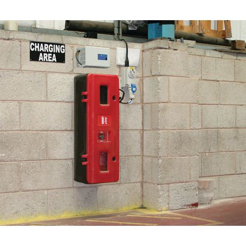 Caja para extintor de 9 a 12 kg. Puede utilizarse tanto en vehículos como en talleres. Montaje de la puerta a derecha o a izquierda. Cerradura con llave. Correa reforzada. Aperturas de policarbonato moldeadas que bloquean los rayos ultravioleta. Bisagras y cierre de plástico. Fabricado en el UK