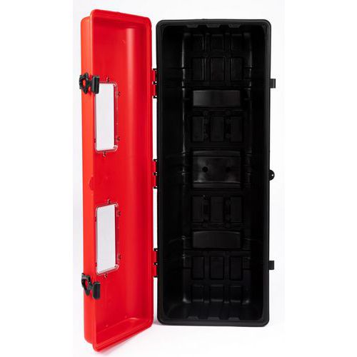 | Nombre del producto | Caja para extintor negra con puerta roja, Material: Polietileno, Color: Rojo, Para extintor peso: 9 kg |