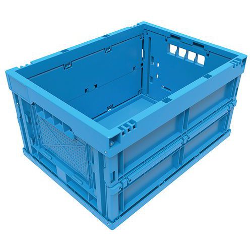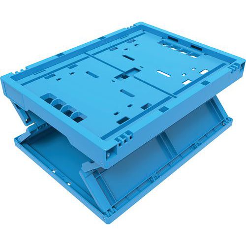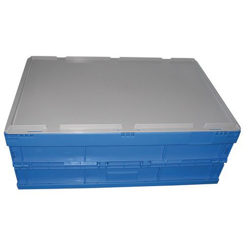 Equipada con bisagras reforzadas y un reborde seguro para su apilamiento.