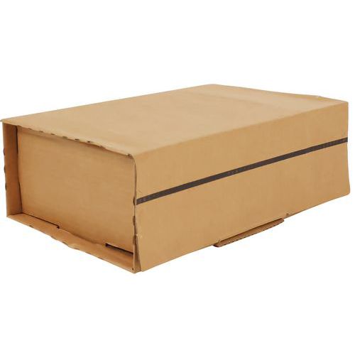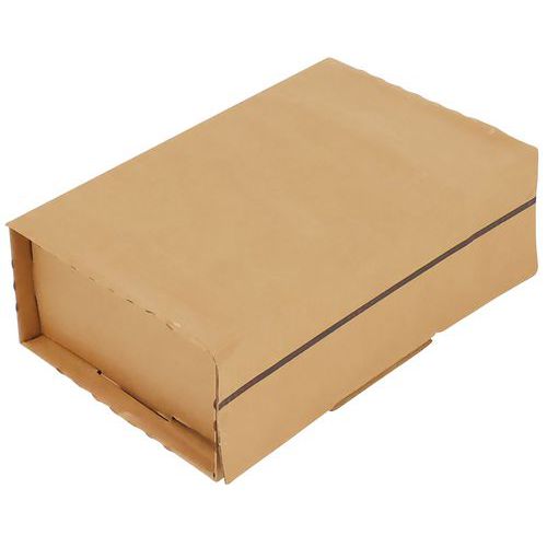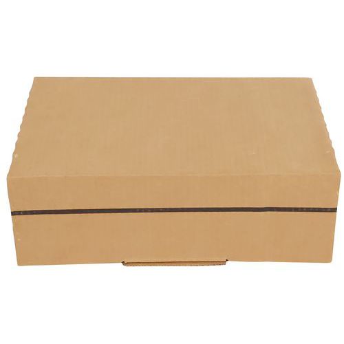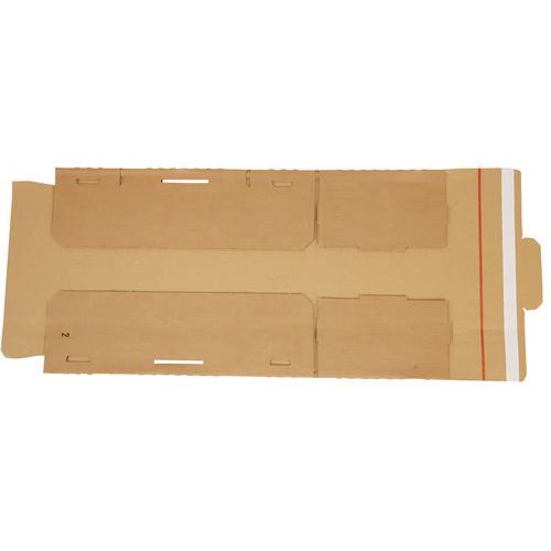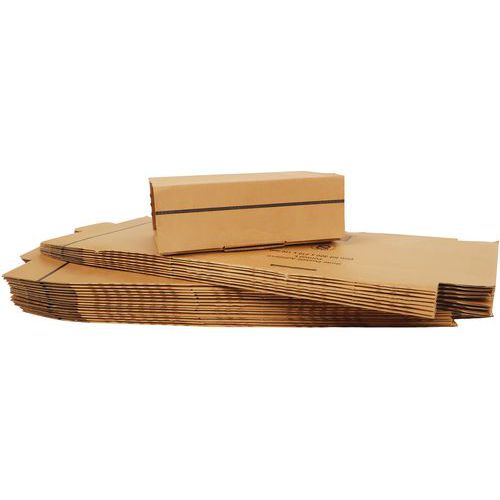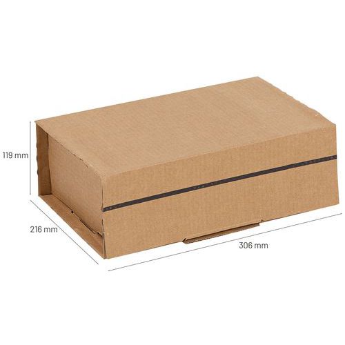 Caja postal con cierre seguro gracias a la banda adhesiva y a los refuerzos laterales. Está lista para usarse y no es necesario añadir cinta adhesiva. Caja de cartón corrugado simple, fácil de montar.