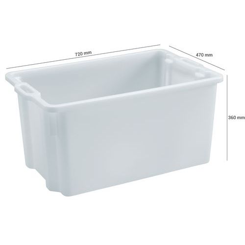 | Nombre del producto | Caja rectangular apilable y encajable, Capacidad: 90 L, Altura total: 360 mm, Anchura total: 470 mm |