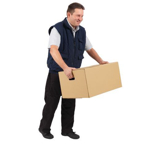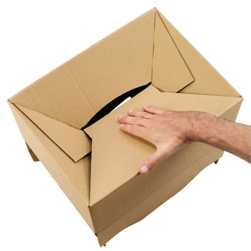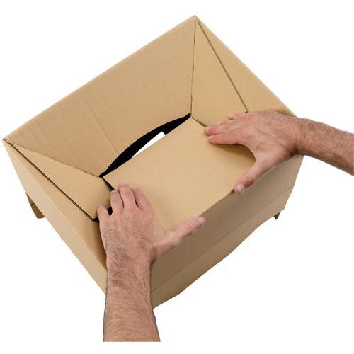 Caja preformada para un armado súper rápido. Resistente gracias a una doble capa en la parte inferior. Caja de cartón con asas laterales. Prepare sus cajas en un santiamén