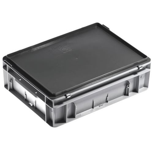 Caja apilable norma Europa con tapa. Equipada con tapa de bisagras con refuerzos y 2 cerraduras con muelles. Dos portaetiquetas en 2 lados (1 en un lado grande en la parte frontal de la caja y 1 en un lado pequeño).