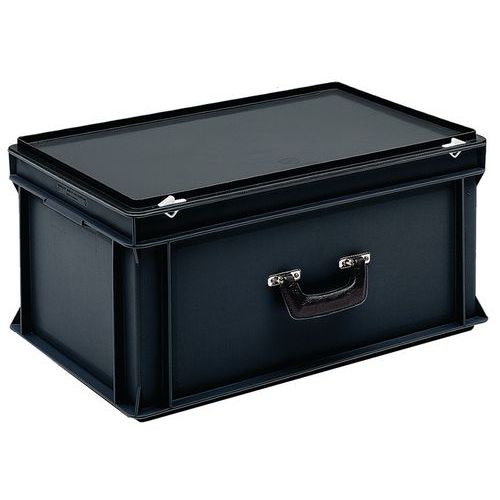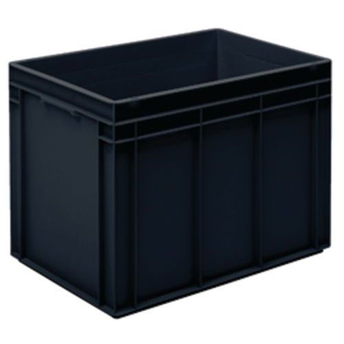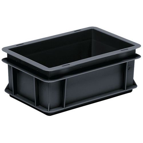 Cajas apilables norma Europa hechas de material conductor con paredes macizas, un fondo macizo o compacto, y dos asas con forma de concha o macizas. Fabricado en la UE