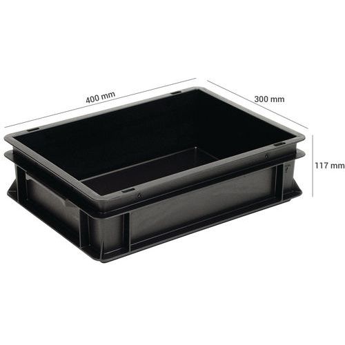 Cajas apilables norma Europa hechas de material conductor con paredes macizas, un fondo macizo o compacto, y dos asas con forma de concha o macizas. Fabricado en la UE