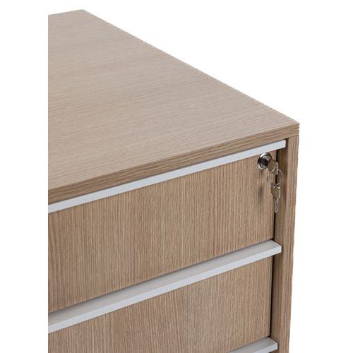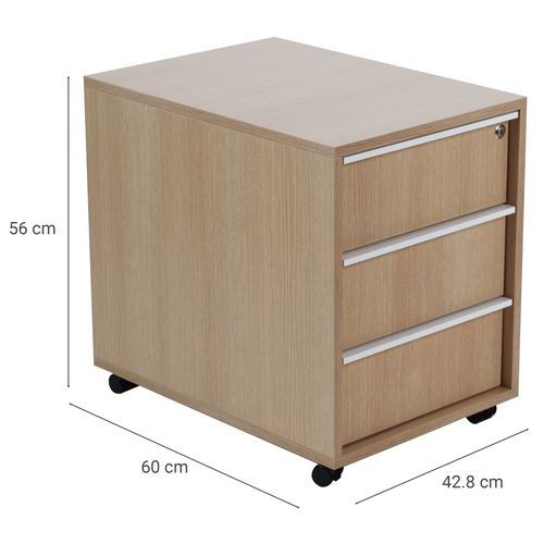 Cajonera móvil Misao melaminada con bordes de 1 mm. 3 cajones con paneles melaminados. Altura de los cajones de 8,6 cm y ancho de 50 cm. Cerradura central, altivuelco. Tirador fabricado con perfil de aluminio anodizado. Carga máxima para cada cajón 25 kg. Ruedas giratorias de 37 mm de diámetro.