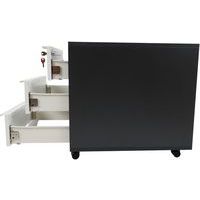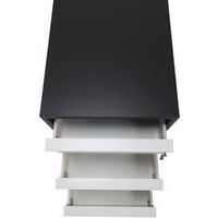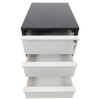 Cajonera móvil Misao melaminada con bordes de 1 mm. 3 cajones con paneles melaminados. Altura de los cajones de 8,6 cm y ancho de 50 cm. Cerradura central, altivuelco. Tirador fabricado con perfil de aluminio anodizado. Carga máxima para cada cajón 25 kg. Ruedas giratorias de 37 mm de diámetro.