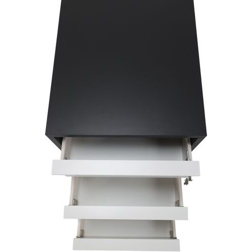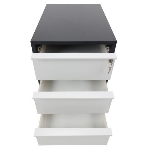 Cajonera móvil Misao melaminada con bordes de 1 mm. 3 cajones con paneles melaminados. Altura de los cajones de 8,6 cm y ancho de 50 cm. Cerradura central, altivuelco. Tirador fabricado con perfil de aluminio anodizado. Carga máxima para cada cajón 25 kg. Ruedas giratorias de 37 mm de diámetro. Fabricado en la UE Garantía al cliente : 10 años