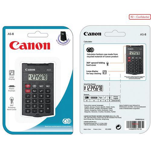 | Datos técnicos | Diseño de arco - Tapas y cubierta de materiales reciclados de Canon - 3 teclas de memoria, 1 tecla de %, Ö &+/- |
