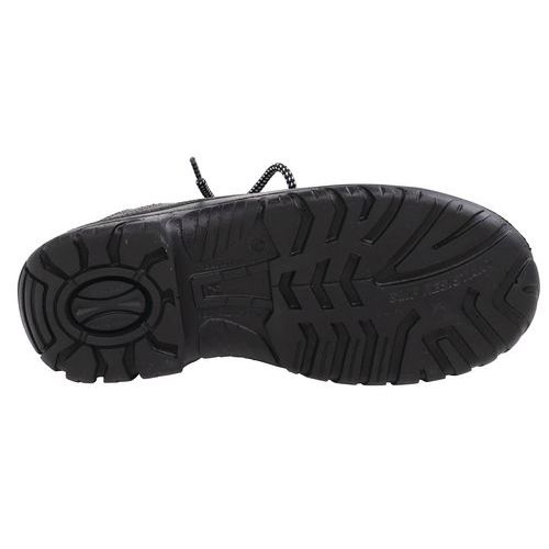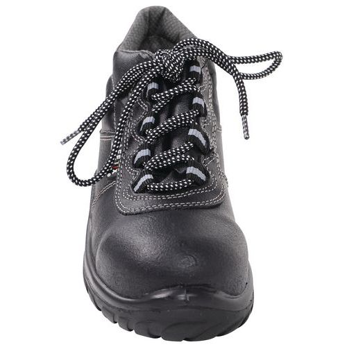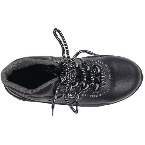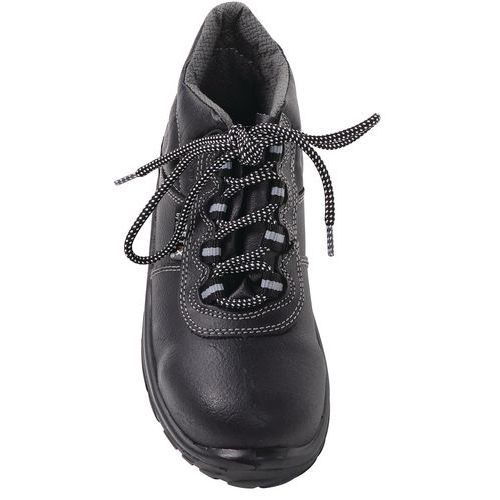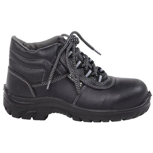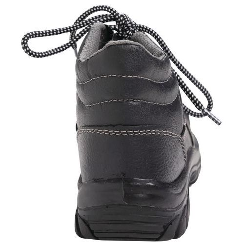 Calzado de seguridad alto con puntera protectora de policarbonato y suela antideslizante Parte superior de cuero graneado de 2-0-2,2 mm de grosor para una mayor resistencia mecánica y durabilidad. Ideal para suelos y entornos industriales. Suela ligera y flexible de PU2D inyectado, antideslizante gracias a su estructura de tacos abierta para un mejor drenaje de líquidos. Tacón definido para mayor seguridad, especialmente en escaleras