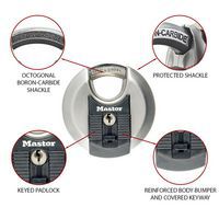 Múltiples aplicaciones en interiores y exteriores para diversos usos. Diseño duradero en acero inoxidable con protecciones reforzadas. Mayor seguridad gracias a un cilindro de 4 pasadores. Arco octogonal de aleación de boro, un 50 % más resistente.