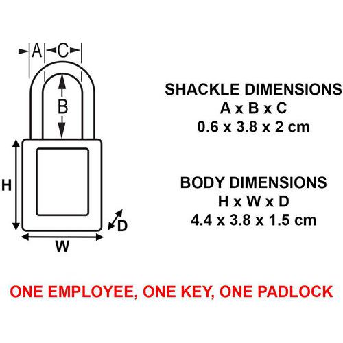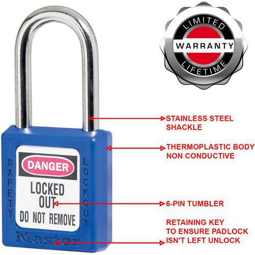 Candado de seguridad termoplástico 410. Cuerpo termoplástico azul de 38 mm de ancho y 44 mm de alto, grillete con una separación de 38 mm. Diseñado exclusivamente para aplicaciones de bloqueo y etiquetado. Cuerpo de cerradura de termoplástico duradero, ligero y no conductor. Cilindro de alta seguridad. Solicite LIFEGUARD: un servicio gratuito que permite registrar los números de las llaves utilizadas por una empresa, con el objetivo de evitar duplicados dentro de los equipos. Indíquelo en su pedido.