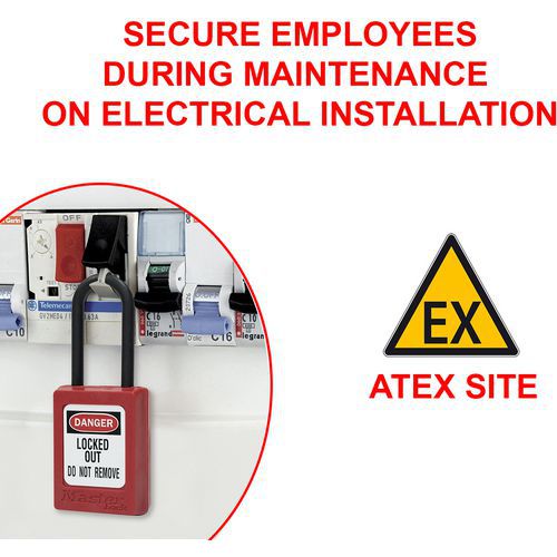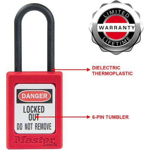 Candado de seguridad de termoplástico y arco de nailon dieléctrico con un diámetro de 4,76 mm para instalaciones eléctricas. Adecuado para zonas y emplazamientos con clasificación ATEX. Sin retención de llave. Arco fino para más aplicaciones de bloqueo. Solicite LIFEGUARD: un servicio gratuito que permite registrar los números de las llaves utilizadas por una empresa, con el objetivo de evitar duplicados dentro de los equipos. Indíquelo en su pedido.