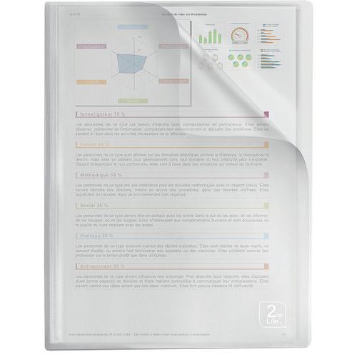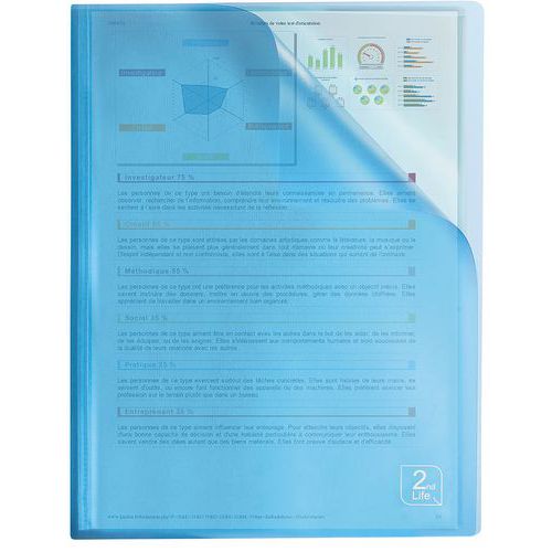 Carpeta de fundas translúcida para formato A4. Surtido de 5 colores (verde, gris, violeta, rojo y azul). Las tapas translúcidas aportan visibilidad para ayudarle a organizar sus documentos. Grosor de 0,5 mm. Fabricado en la UE