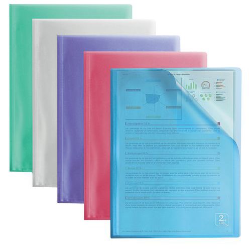 Carpeta de fundas translúcida para formato A4. Surtido de 5 colores (verde, gris, violeta, rojo y azul). Las tapas translúcidas aportan visibilidad para ayudarle a organizar sus documentos. Grosor de 0,5 mm.