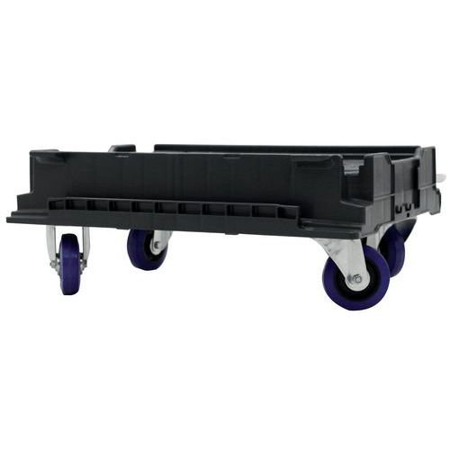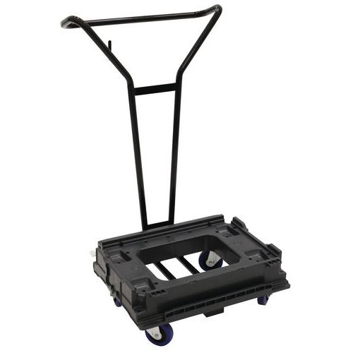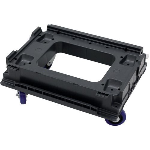 Carro ergonómico y robusto para cajas apilables. Conexión sencilla: solo hay que deslizar un carro dentro de otro. Carro que ahorra espacio, apilable cuando no tiene carga. Desconexión simple con solo presionar un pedal. 4 ruedas pivotantes con cubiertas de goma (una con freno).