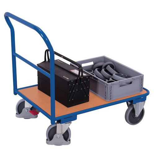 Carro de acero con respaldo tubular adaptable con chasis mecano-soldado resistente a los impactos y a los arañazos. Plataforma melaminada color haya. Equipada con una barra de empuje horizontal con la posibilidad de añadir una segunda opcional. Rueda con cubierta de goma termoplástica gris antimarcas y freno EasySTOP. Carga (kg) : 500 Garantía al cliente : 3 años