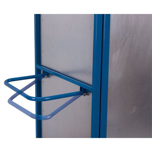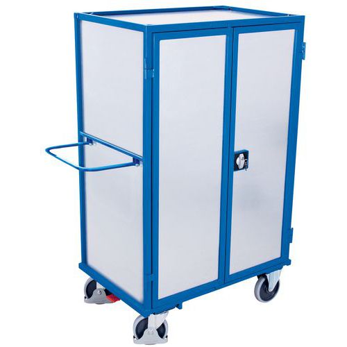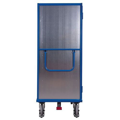 Carro con bandejas robusto con estructura mecano-soldada y puertas abatibles con llave. Revestimiento de epoxi resistente a impactos y arañazos. Ruedas con cubiertas de caucho termoplástico a prueba de pinchazos con rodamiento de bolas de precisión. Equipado con pedal de freno centralizado EasySTOP que se activa con un simple movimiento de pie. Este sistema de frenado permite bloquear las ruedas del carro con toda seguridad. Carro con bandejas ergonómico de fácil utilización y que requiere pequeños movimientos. Carga (kg) : 500 kg