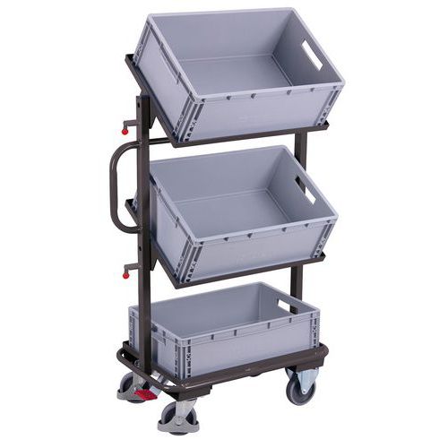| Nombre del producto | Carro con cajas norma Europa, Carga: 200 kg, Altura total: 1385 mm, Anchura total: 455 mm |