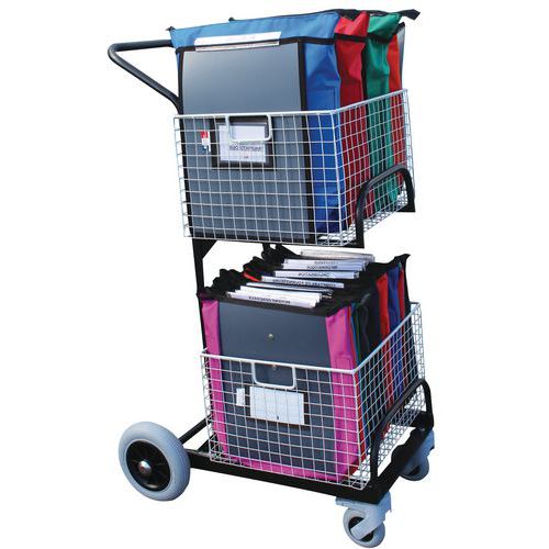 Carro de distribución de correo compacto con asa redonda. Bandejas de dimensiones útiles 450 x 400 x 180 mm. Carga admisible 25 kg por cesta. 2 ruedas traseras diám. 200 mm. 2 ruedas directrices en la parte delantera diám. 100 mm. Chasis tubular de acero mecanosoldado con revestimiento epoxi. Cuerpo de ruedas de polipropileno, cubierta de espuma de poliuretano sobre rodamientos.