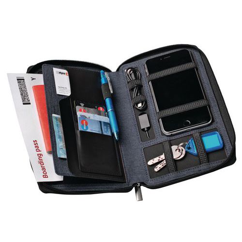 Equipado con varios compartimentos (tarjetas, pasaportes, smartphone (6), etc.), con cierre de cremallera y correa desmontable.