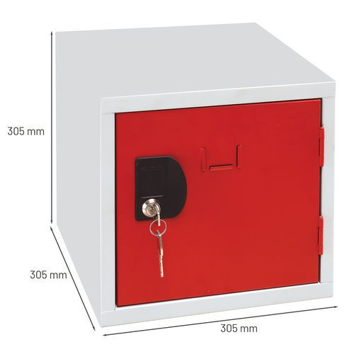 Vestuario cúbico preperforado para montar. Cierre con llave con cerradura de cilindro. Casillero con portaetiquetas. Cómodo gracias a la apertura de 180° de la puerta.