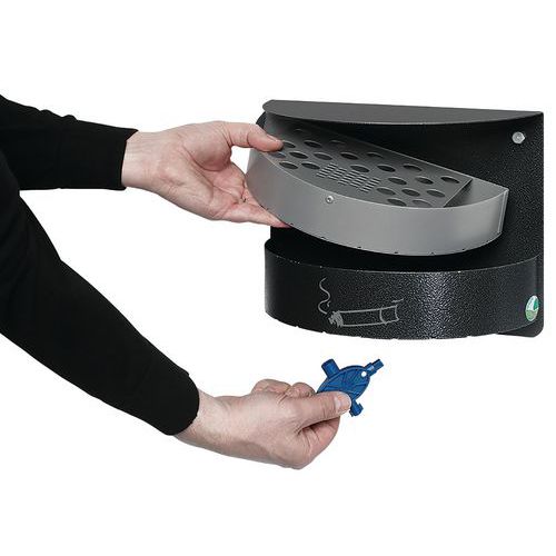 Cenicero de pared para exterior con cubierta de protección contra la lluvia. Resistencia a la intemperie con revestimiento de polvo epoxi anti-UV. Resistente: construcción sostenible de calidad, material chapa de acero galvanizado. Cenicero de vaciado fácil, protegido con llave de paletón doble (1 llave), antirrobo.