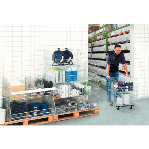 Llenado y acceso fáciles, incluso cuando las cestas están apiladas. Muy robusta, soporta hasta tres veces su carga máxima por unidad.