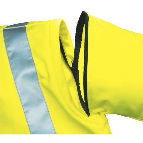 Cierre por cremallera hasta el cuello. Puños ajustables mediante cintas de sujeción. Protector de riñones. Chaqueta con mangas extraíbles. Múltiples bolsillos. Apriete mediante elástico con bloqueo para cordones. Bandas retrorreflectantes 3M™ Scotchlite™. Cuello recto con forro. CE